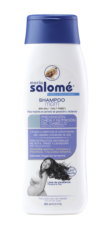 Para mujeres en periodo de Gestación y Lactancia. Prevención Caída Y Nutrición Del Cabello. Limpia y estimula el crecimiento del cabello nutriendo la raíz con extractos naturales de soya, trigo y levadura La fórmula exclusiva del Shampoo Mom de María Salomé está elaborada con soya, trigo y levadura que acondicionan, dan brillo y sedosidad al cabello; además contiene un liposoma capilar cuaternizado que aporta un complejo vitamínico al cabello nutriéndolo, revitalizándolo y ayudando a prevenir su caída.