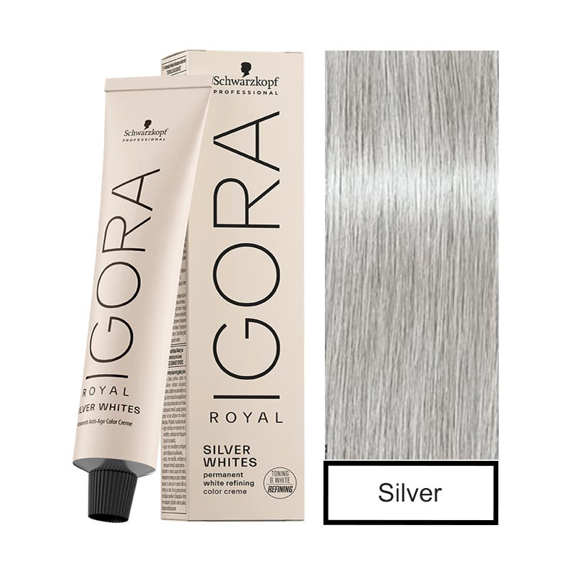 IGORA ROYAL Silver Whites Matizador Gris va dirigido a cabello con un 70-100% de canas y con una base 6 y más clara. Embellece y aporta brillo a las canas y al cabello gris y blanco. La Tecnología de IGORA ROYAL Silverwhites contiene silamina y colágeno, un contenido bajo en amoníaco y un pH bajo para embellecer de forma personalizada el cabello gris y blanco, sin comprometer la calidad del cabello.